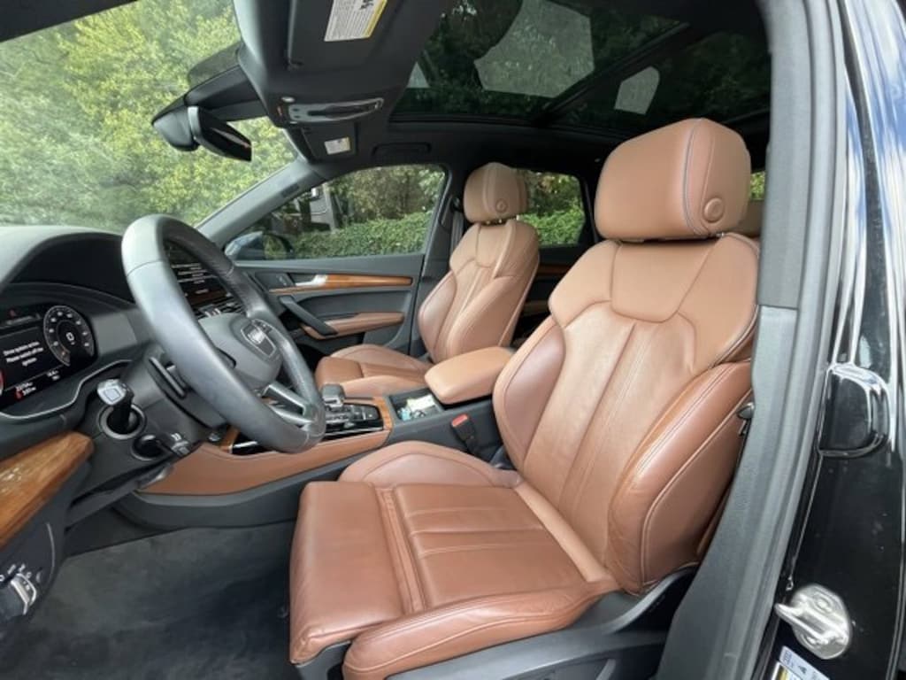 Clean CARFAX. CARFAX One-Owner. Mythos Black Metallic 2023 Audi Q5 45 S line Premium quattro quattro 7-Speed Automatic S tronic 2.0L Turbocharged Okapi Brown w/Leather Seating Surfaces, Audi Active Lane Assist, Audi Advanced Key, Audi Virtual Cockpit Plus, Auto-Dimming Power Folding Exterior Mirrors, Bang & Olufsen Sound System w/3D Sound, Convenience Package, Driver Seat Memory, Hands-On Detection Steering Wheel, Heated Steering Wheel, Leatherette Covered Center Console & Door Armrests, Manual Rear Side Window Sunshades, Panoramic Sunroof, Power Adjustable Steering Column, Premium Plus Package, SiriusXM w/360L, Top View Camera System, Traffic Jam Assist, Ventilated Front Sport Seats w/4-Way Power Lumbar, Warm Weather Package, Wheels: 19" 5-Double-Arm Design Bi-Color Finish.